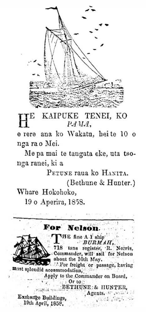 Bethune & Hunter placed ads in both English and Te Reo Māori newspapers. These clippings announce space for passengers heading to Nelson / Wakatu on the ship Burmah.