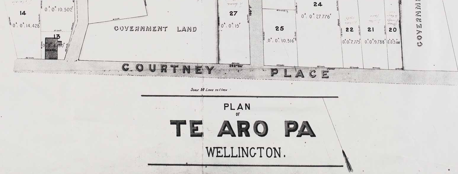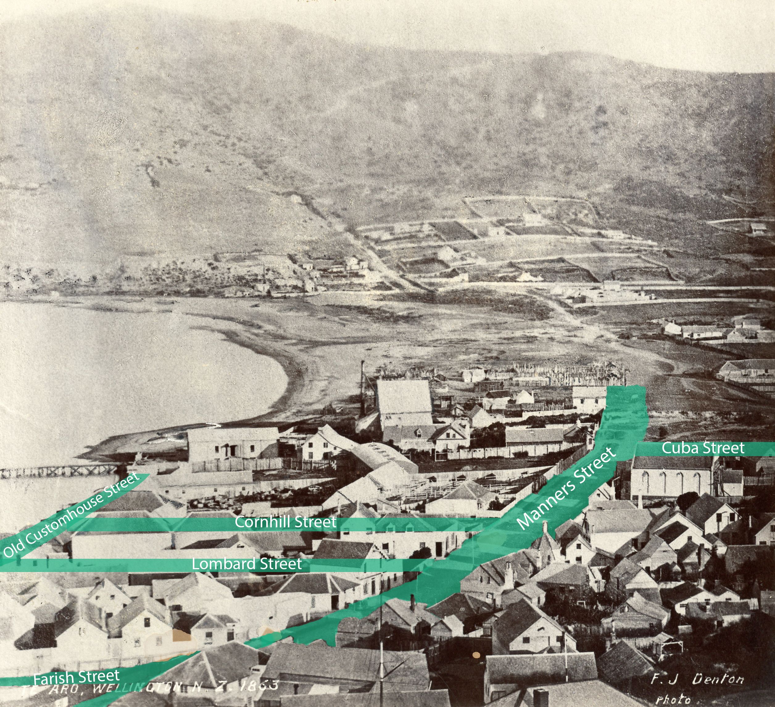 At this stage Cuba Street is much shorter than today and stops at Manners Street. The shape of these streets were defined firstly by the curve of the beach and secondly by the town acres that were surveyed for early European settlers to purchase. After the foreshore was reclaimed and Wakefield Street built, a portion of Town Acre 211 was acquired by the City Council to extend Cuba north of Manners Street.