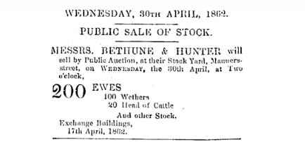 An 1862 newspaper advertisement regarding the sale of stock at the Manners Street yards.