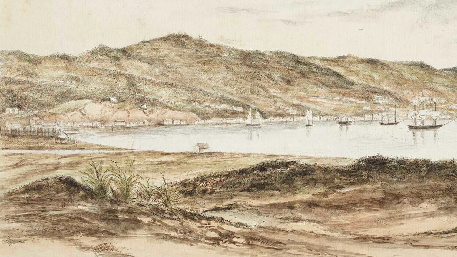 An 1840s illustration by Robert Park showing the Te Aro foreshore. Sourced from the Alexander Turnbull Library.