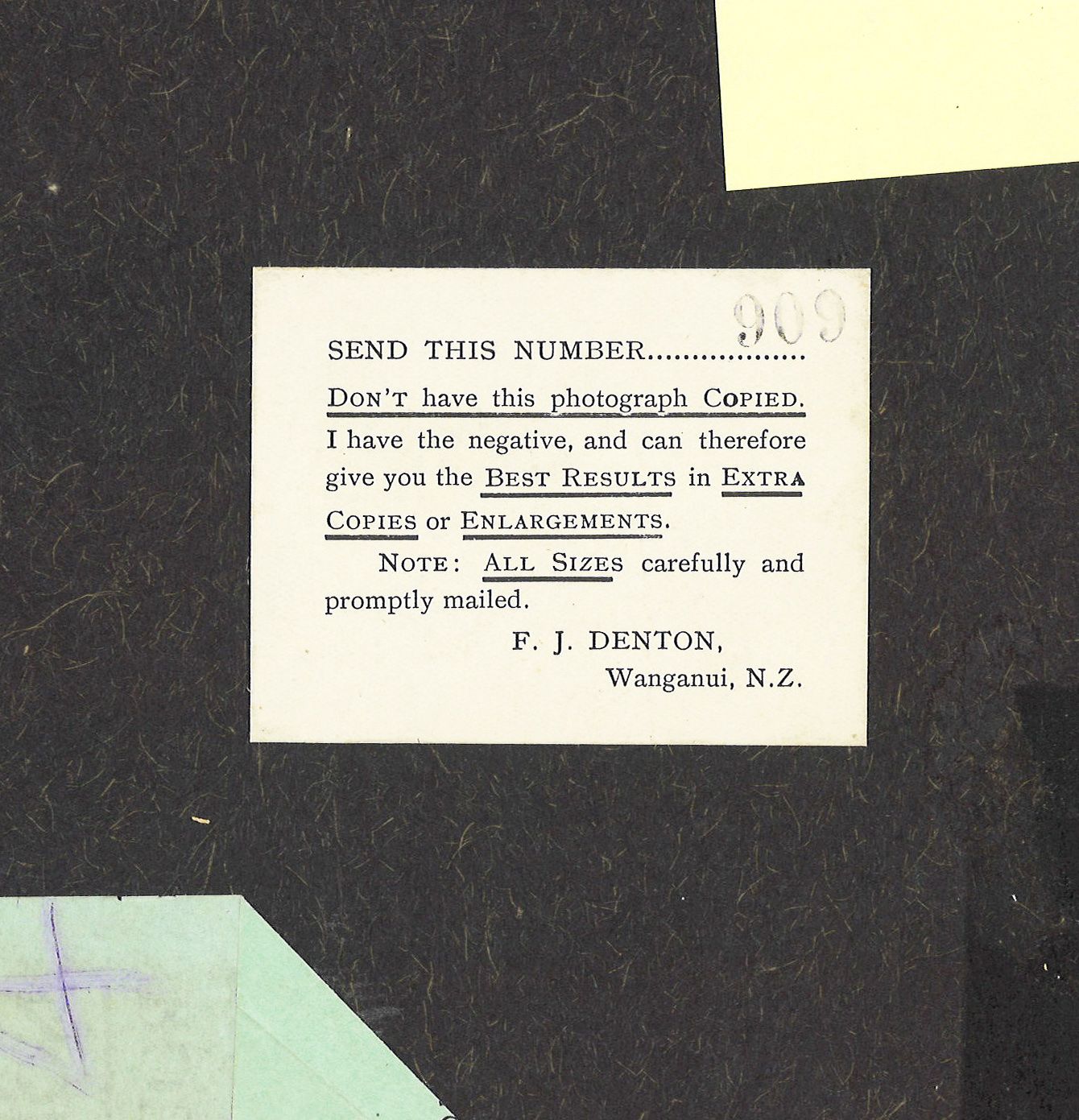 Upon investigation it turns out that photographer F. J. Denton of Whanganui wasn't born until 1869 - six years after the photo was allegedly taken. What appears to have happened is Denton purchased the aged negative from an unknown photographer and reproduced it at his own studio, selling it under his own name. At a time before mass-produced photographs, many small companies did this to boost their profits.